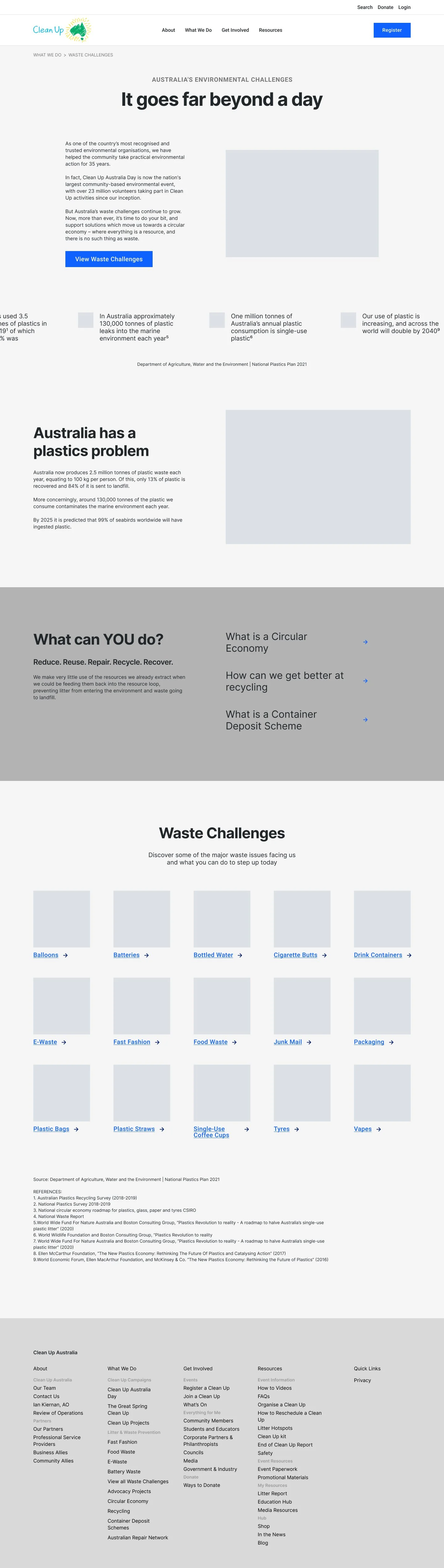 Clean Up Australia inspires and mobilises communities to improve and conserve our environment, eliminate litter and end waste.